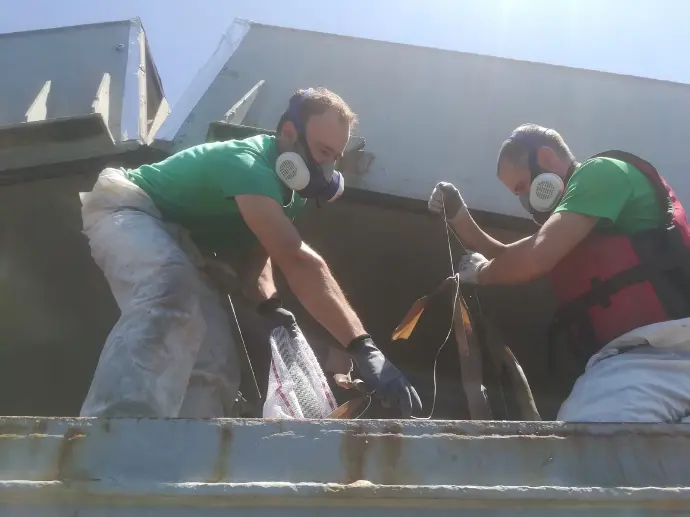 Una vez pasen los días necesarios, que suele ser mínimo entre 7 y 10 días (pueden ser más), otra empresa o nosotros, en caso de que el barco siga aquí, se retiran los sacos gracias a las cuerdas colocadas previamente y ya el grano quedaría totalmente fumigado y libre de plagas.